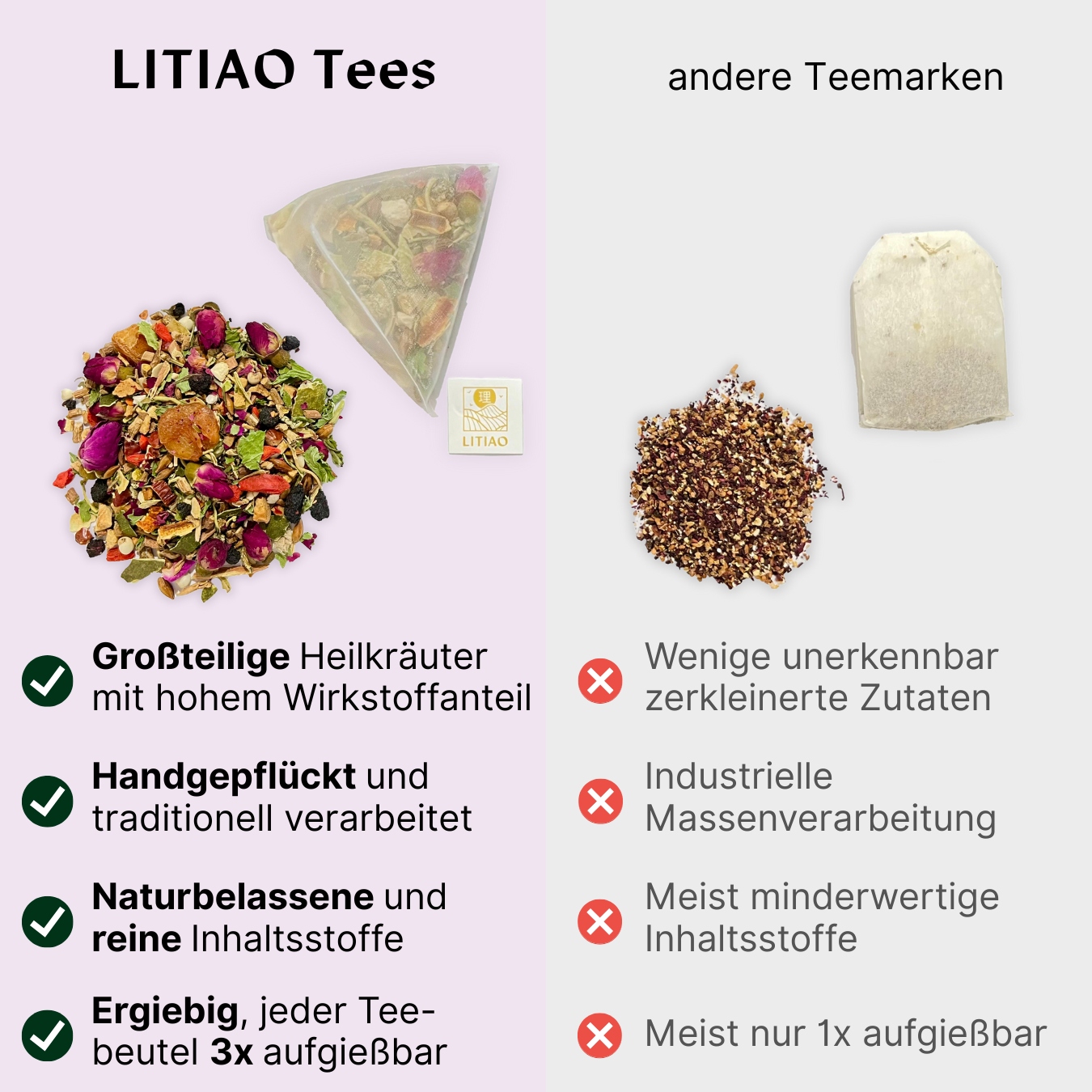 Herkömmlicher Tee verliert nach einem Aufguss an Wirkung und Geschmack – LITIAO Tees aber begleiten Sie den ganzen Tag mit mindestens drei Aufgüssen voller Wirkstoffe.